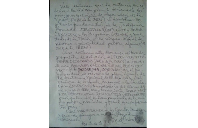 En la carta, Baduel insiste en que se realice una Asamblea Constituyente.