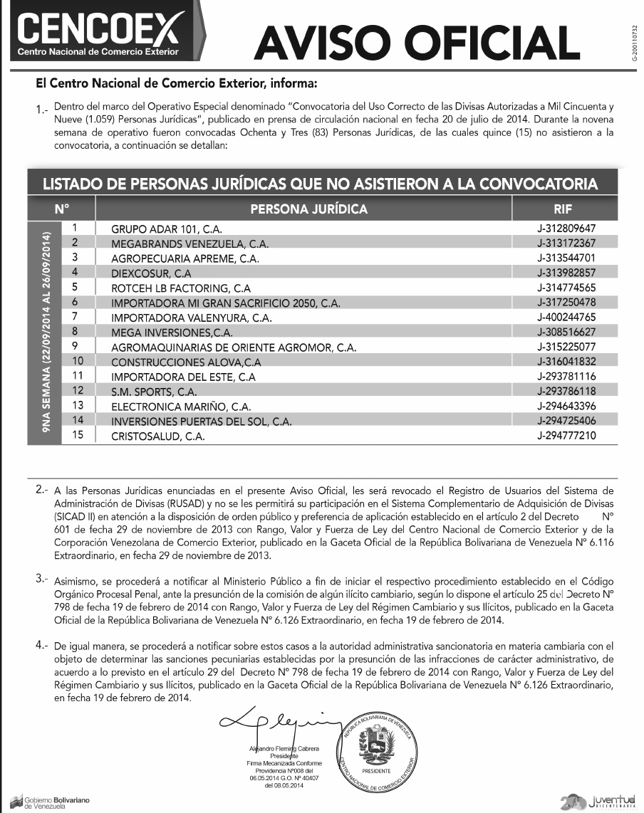 En el período del Operativo Especial denominado “Convocatoria del Uso Correcto de las Divisas Autorizadas a Mil Cincuenta y Nueve (1.059) Personas Jurídicas”, publicado en la prensa nacional el pasado 20 de julio de 2014, Cencoex citó a 83 Personas Jurídicas, de las cuales 15 no asistieron al llamado, reseña la web La Patilla.